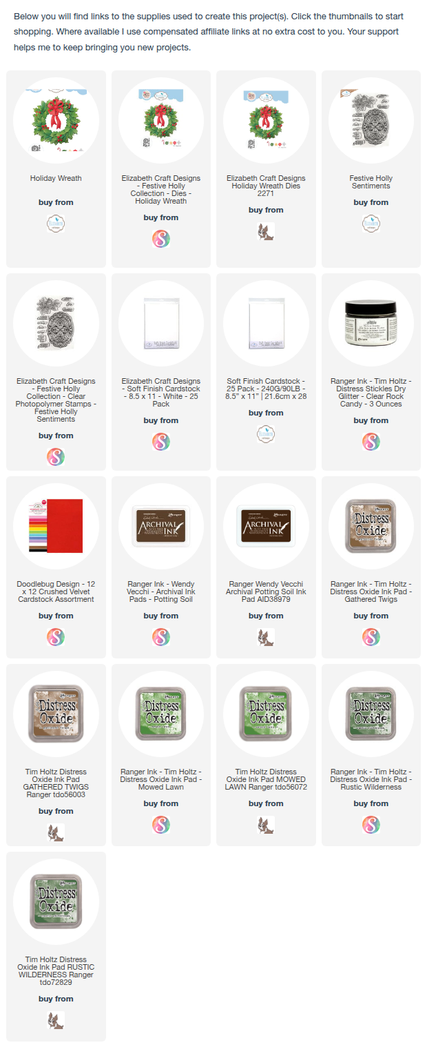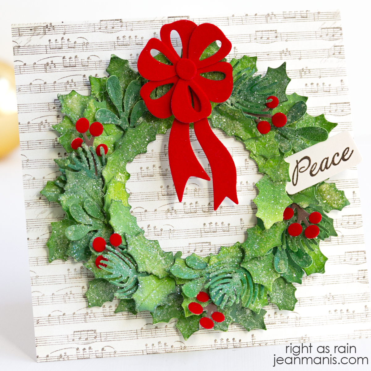 I created a 5 1/8″ card base and covered it with patterned paper from my stash. I cut the wreath pieces from soft finish cardstock, colored them with Distress Oxide inks, and hand-shaped the elements for added dimension. Once assembled, I added a subtle glaze (Judikins Diamond Glaze) and dry glitter to give the wreath a frosty holiday sparkle. The berries and ribbon were created with Doodlebug velvet cardstock. The sentiment was stamped in Potting Soil ink and cut with a now-retired Sizzix tag die.