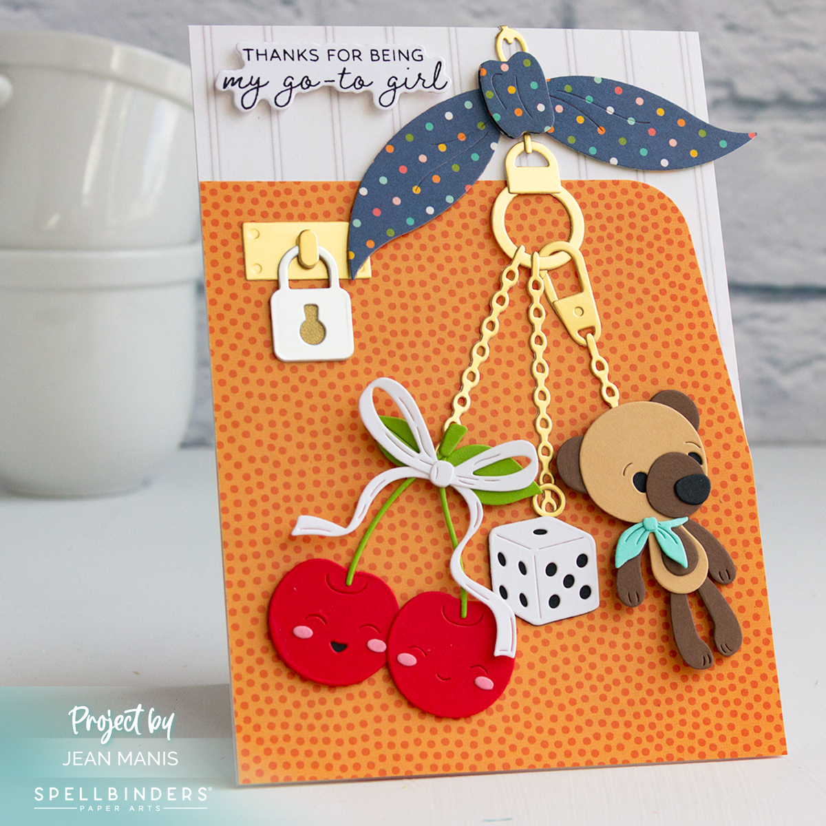 Hello! Today I’m sharing a friendship-themed card created with the Spellbinders November Large Die of the Month. This die set builds an adorable purse and a variety of bag charms, which is very on-trend right now! I paired the finished purse with a sentiment from this month’s coordinating Go-To Girl Clear Stamp Set. This card is perfect for sending a little appreciation to a friend who’s always there for you.