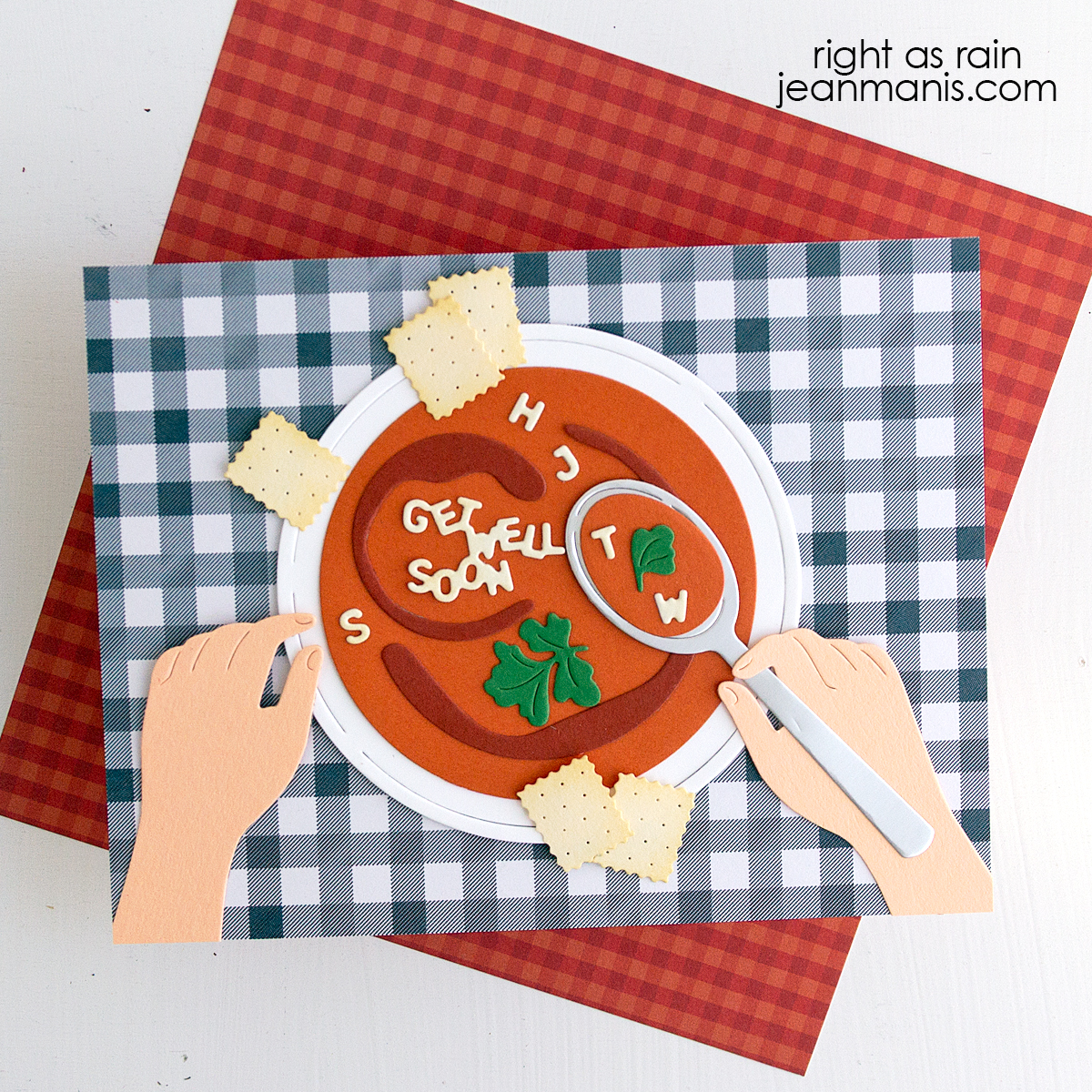 Hello and happy December! I didn’t expect this card to be quite so fun to make but the Hero Arts Alphabet Soup die set, this month’s Hero Studio Die Set of the Month turned out to be one of those kits that invites you to play. As I built the little bowl of tomato soup, adding the spoon, crackers, and floating letters, I found myself enjoying the scene-building far more than I anticipated. And the black-and-white check patterned paper gave the whole card a warm, kitchen-table charm. And honestly, “Get Well Soon” cards are ones we reach for more often than we think. The card feels nurturing rather than saying, “oh woe, you’re sick.”