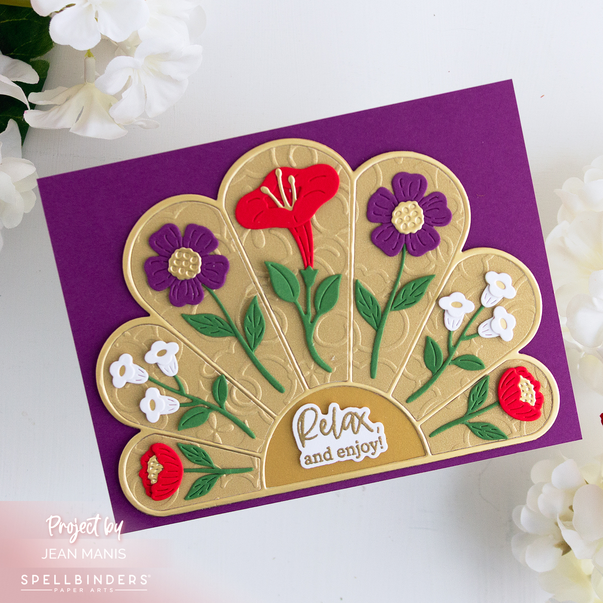 Hello! Today, I am sharing a card created with the January Die of the Month for Spellbinders. The structure of the die did most of the work. The set cuts a graceful fan shape, and I dry-embossed the individual fan pieces to add subtle texture before layering them together. The floral elements sit on top of the fan. I chose a rich palette of deep, saturated colors from the ColorWheel cardstock that feel especially welcome this time of year. A simple sentiment is included at the bottom of the frame, keeping the emphasis on the design and texture of the card.