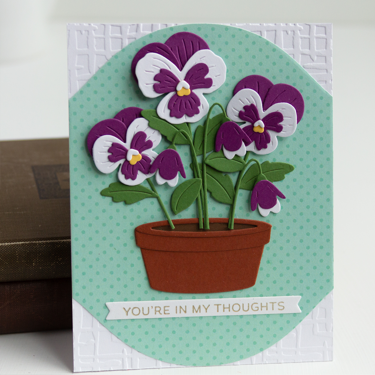 - Cut the pansies, greenery, and pot from a variety of cardstock colors using dies in the Small Die set. Assemble as required.