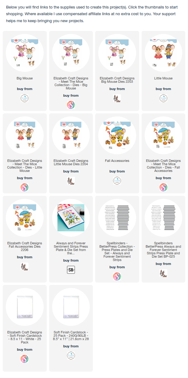- Cut the Little Mouse, Big Mouse, and Fall Accessories from Soft Finish Cardstock. Color with Distress Oxide inks (Tattered Rose, Black Soot, Spun Sugar, Blueprint Sketch, Candied Apple, Squeezed Lemonade, Hickory Smoke) and assemble.